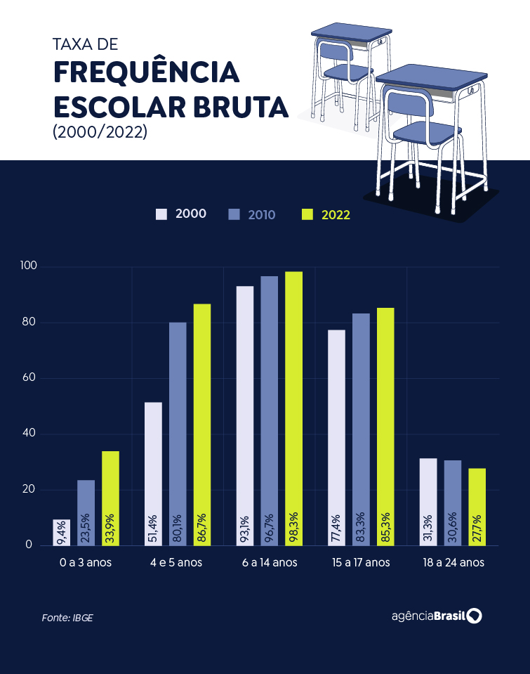 As taxas de frequência de crianças acima de 6 anos e de adolescentes até 17 anos também cresceu de 2000 para 2022. As crianças de 6 a 14 anos na escola passaram de 93,1% em 2000 para 98,3% em 2022. Já os adolescentes de 15 a 17 anos matriculados passaram de 77,4% para 85,3%.